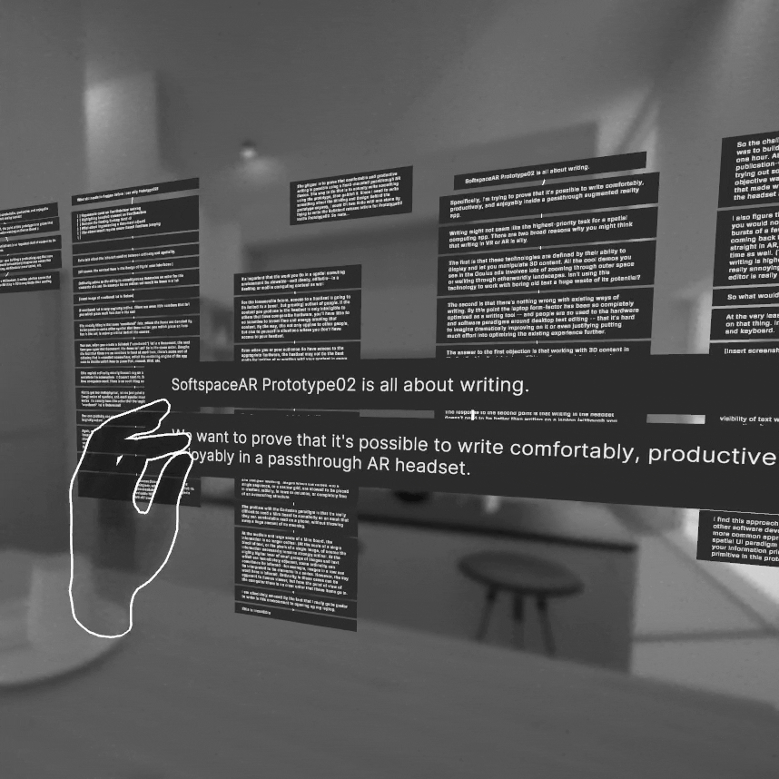 I wanted to tackle writing head-on and de-risk it before prototyping other aspects of SoftspaceAR. This isn’t to say that the writing experience needs to be perfectly on par with that of your MacBook (although I made some interesting discoveries about the advantages of writing in a headset; more on that below). It just needs feel good, and not get in your way when you want to do it.